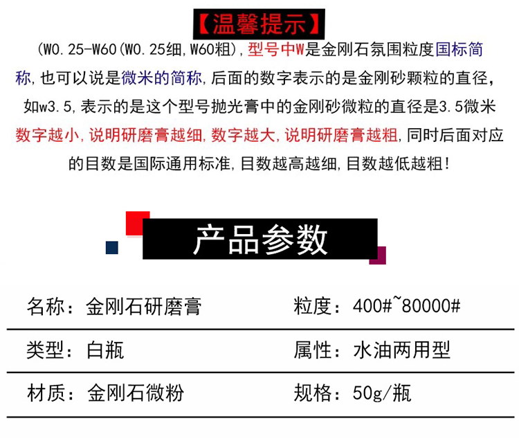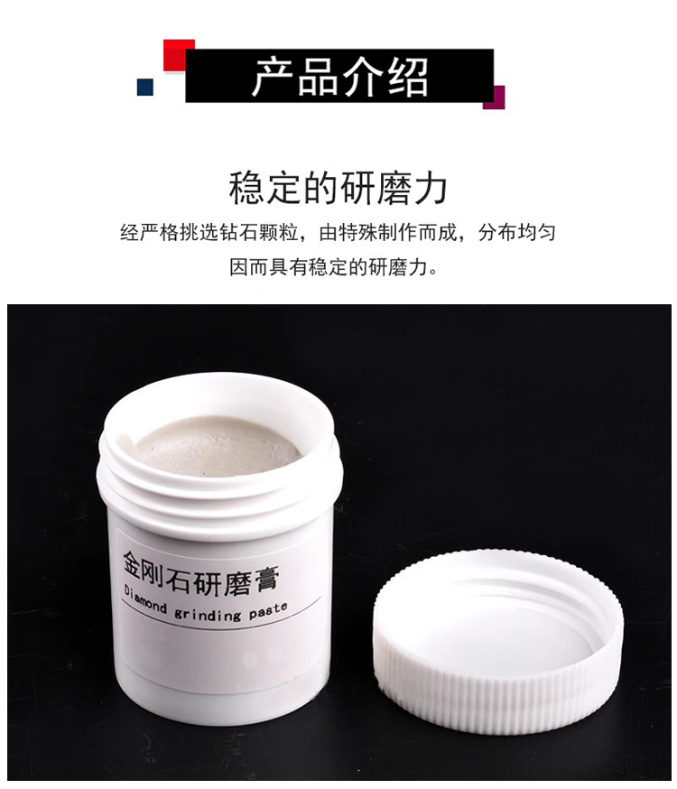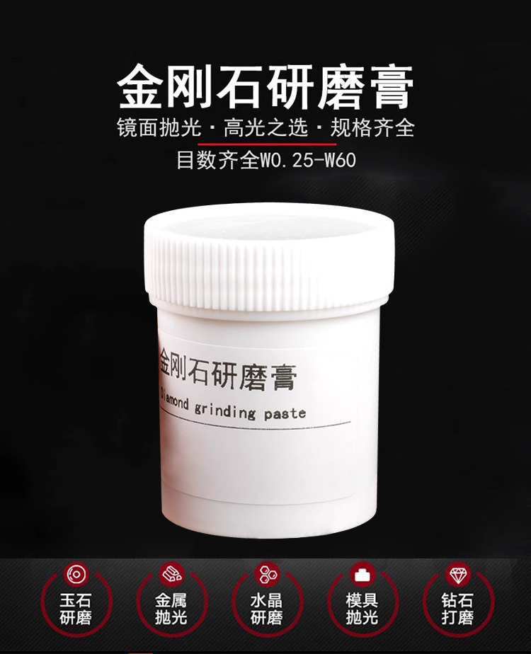 金剛石研磨膏適用于翡翠、瑪瑙、水晶、玉石,琥珀等工藝品、陶瓷硬質(zhì)合金等高硬度材料制品的量具、刃具光學(xué)儀器及其他高光潔度工件的研磨,拋光加工。